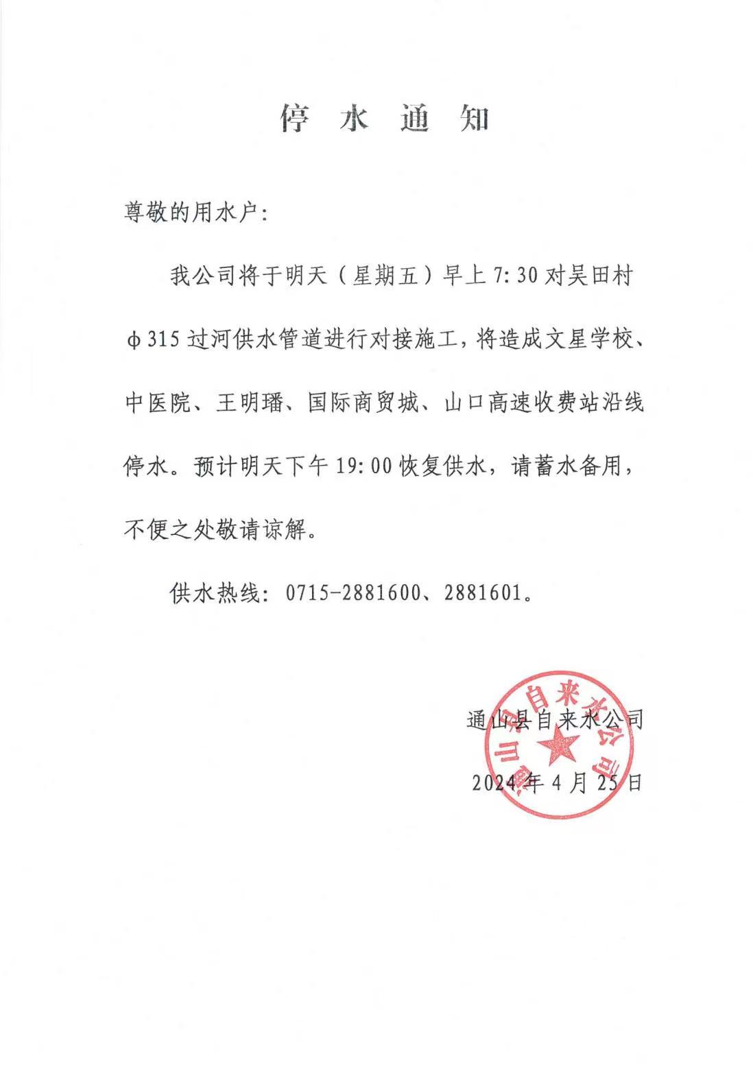 通山县自来水公司将于明天(星期五)早上7:30对吴田村φ315过河供水管道进行对接施工,将造成文星学校、中医院、王明璠、国际商贸城、山口高速收费站沿线停水。预计明天下午19:00恢复供水,请蓄水备用,不便之处敬请谅解。