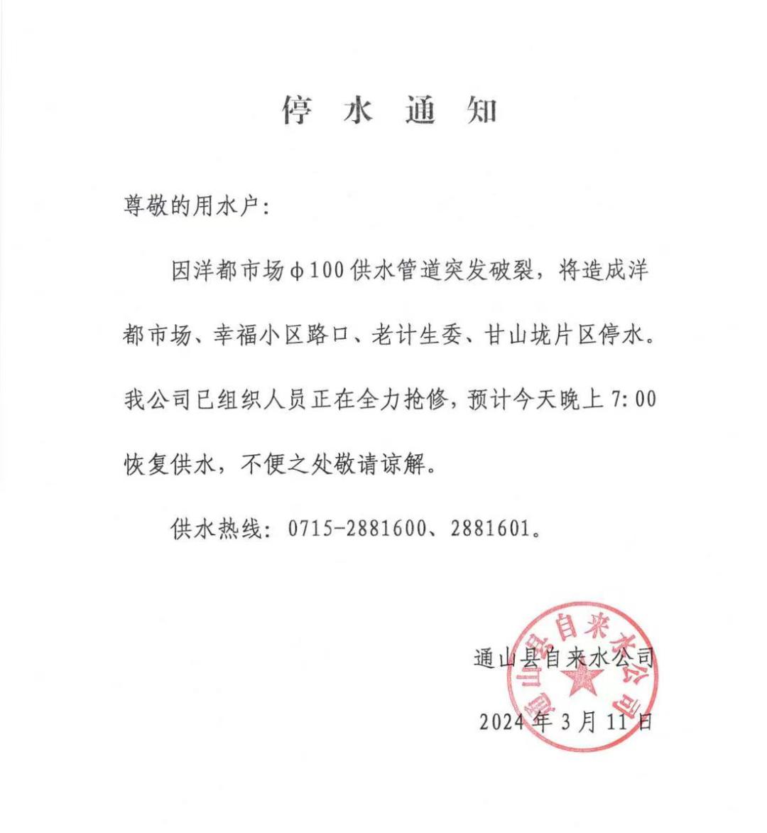 因洋都市场φ100供水管道突发爆裂,将造成洋都市场、幸福小区路口、老计生委、甘山垅片区停水。我公司已组织人员正在全力抢修,预计今天晚上7:00恢复供水,不便之处敬请谅解。供水热线:0715-2881600、2881601。